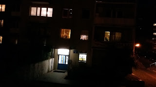 budownictwem, sklepami, parkingami, itp przyziemnościami. Wobec powyższych okoliczności musiałem z zapytaniem zaczepić pewnego tubylca, który palcem wskazał na blok, na który niemal wjechałem nosem. Jegomość jeszcze tylko dorzucił: "tylko proszę z drugiej strony". Wrażenie pierwszego namacalnego kontaktu, dla kogoś podobnie wielbiącego komedie Barei, trudne do opisania. Pomimo już zarysowanej ciemności, to jednak naprawdę było to !!! Przy wejściu po lewej jedyny w swoim charakterze mur, no i nadal widnieje usypany słynny kopiec, na którym Stanisław Anioł nakazał panu Kołkowi ułożyć z kamieni orła z rozpostartymi skrzydłami. Wejść do środka nie sposób - domofony. Ale ustrzelić fotki - jak najbardziej. Mieszkańcy mijają odwiedzających fanów w milczeniu i zrozumieniu, choć jednej pani nawet zarysował się lekki uśmieszek z racji naszego skretyniałego całym wydarzeniem podniecenia. Pewnie pomyślała: kolejna grupa idiotów. Ustrzelone selfie z tabliczką "Alternatywy 4" zachowam na pamiątkę - próby najwyższej, jak też cały genialny występ Sophii.