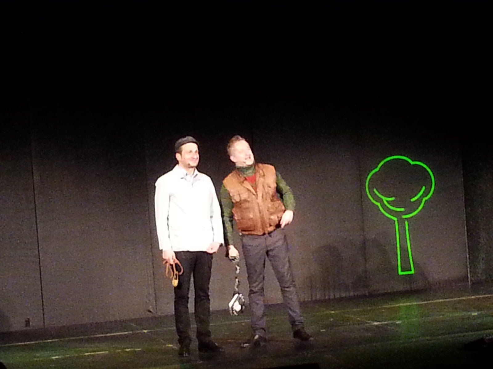 Scena przyozdobiona najskromniej jak to możliwe. Przed spuszczoną kotarą jedynie rozstawiony ciemny jednolity parawan, i tylko neony rzucane gdzieś tam z rzutnika. Oto z rzadka jedyny zmieniający się wystrój. Jak się później miało okazać, nawet to nie było potrzebne. Aktorzy KMN doskonale bez wspomagaczy pobudzają wyobraźnię.